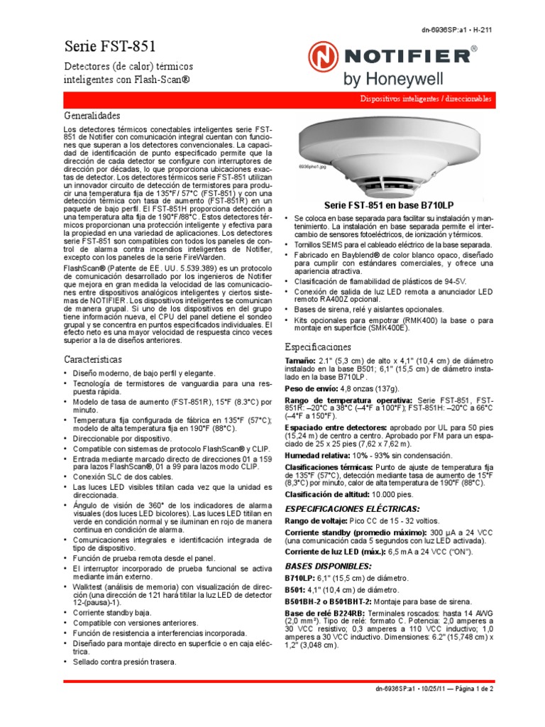 Detector De Calor Fst 851 Science Ingenieria from imgv2-1-f.scribdassets.com Detector sensitivity can be programmed in the control panel software. Notifier's photoelectric detector's unique optical sensing chamber is engineered to sense smoke produced by a wide range of combustion sources. La sensibilidad del detector se puede programar en el software del panel de control. Relé, aislante y bases de sonda opcionales. Has been added to your cart. 15 a 32 volts temperatura de instalacion: Its sensitivity is continuously monitored and reported to the panel. Available with a lead time.