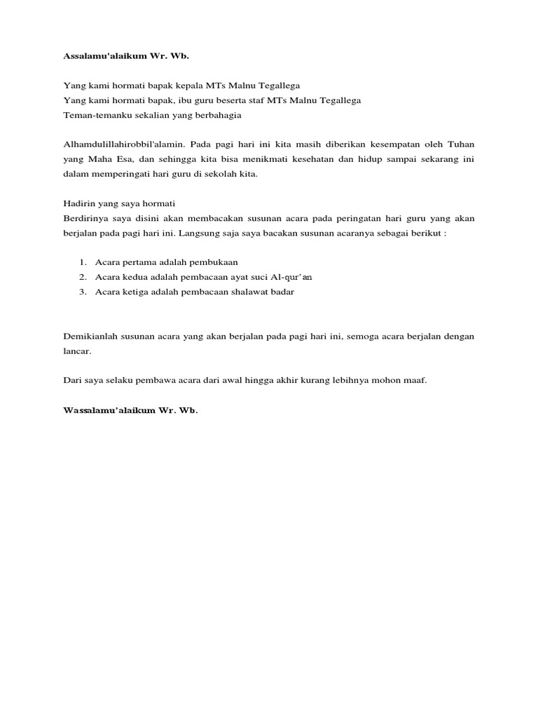 السلام عليكم ورحمة الله وبركاته. Guru selalu mempunyai masalah untuk membuat teks pengacara majlis. Teks mc formal acara peringatan hari nasional. Sebelum acara malam hari ini dimulai, perkenankanlah kami untuk membacakan susunan acara yang akan dilaksanakan pada malam hari ini. Guru itu pengganti ayah ibu.
