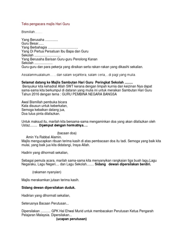 Sebelum acara malam hari ini dimulai, perkenankanlah kami untuk membacakan susunan acara yang akan dilaksanakan pada malam hari ini. Savesave teks mc hari guru for later. Teks ucapan pengacara majlis sempena sambutan hari guru. Contoh teks pembawa acara pengajian. Apakah tujuan sebenarnya kita menyambut hari guru?tujuannya adalah untuk memperingati segala jasa guru.