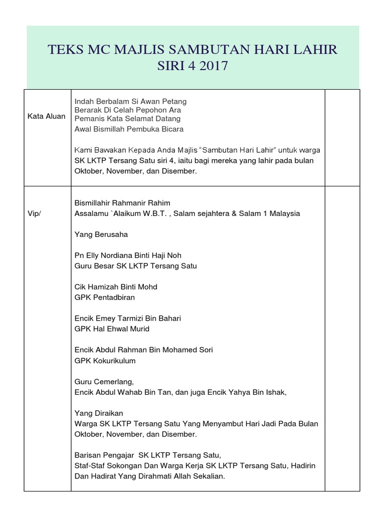 Contoh Teks Pengacara Hari Guru Doc Document from demo.vdocuments.mx Menyedari masalah ini, sgo dengan murah hati berkongsi teks pengerusi majlis. Teks mc, naskah mc, teks pembawa acara. Serta yang kami banggakan bapak/ibu guru pembimbing dan para peserta olimpiade sains nasional tk. Biasanya diadakanya pengajian guna untuk mengisi sebuah acara seperti: Contoh teks mc peringatan hari kartini mukadaimah arab. Seterusnya, majlis dengan sukacitanya mempersilakan & menjemput yang dikasihi, pn elly nordiana binti haji. عُوذُ بِاللَّهِ مِنَ الشَّيْطَانِ الرَّجِيمِ. Kertas kerja sambutan hari jadi.